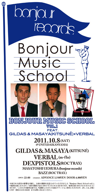 最先端ミュージック・カルチャーの震源地として知られ、代官山と福岡に店舗を構えるミュージック・セレクト・ショップ『bonjour records』が、オフィシャル・パーティ『Bonjour Music School』を2011年10月8日に代官山のUNITにて”再”始動させる。