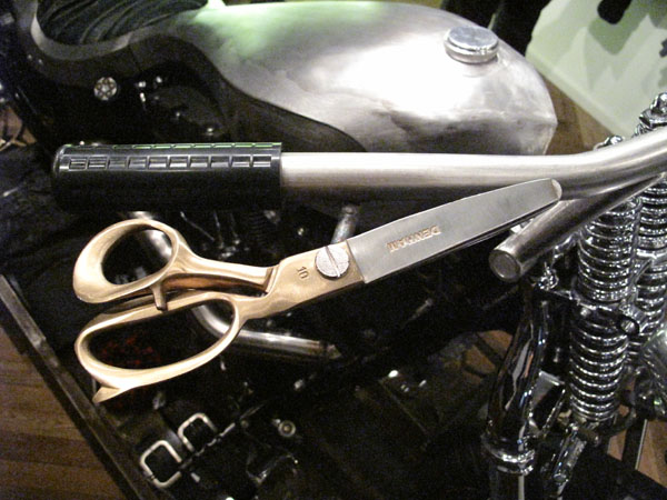 このバイク、正面から見ると普通に見えるが、ブレーキとクラッチの部分が『DENHAM』のロゴであるハサミになっていたり。。。