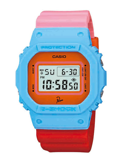 今回のタイアップモデルは、シンプルな「DW-5600」をベースに、彼の作風であるパステル調のカラフルな色使い、ELバックライト発光時にはパラの代表的なモチーフである鳥の頭を起用、そして文字板と裏蓋には「Parra」のロゴを配置するなど、かなり個性的なデザインで、彼の世界観を表現している。