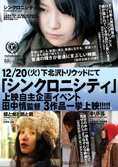 先日公開された映画『シンクロニシティ』や『キリトル』で、インディーズ映画界に新たな風を巻き起こした”田中 情”監督の3作品が一堂に公開される上映企画が、2011年12月20日に下北沢トリウッドにて開催される。