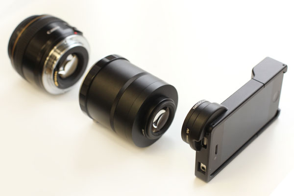 アルミから削り出したイカツいフォルムとスマートなiPhone、ゴツい一眼レンズは、簡単に装着、そして撮影が可能だ。