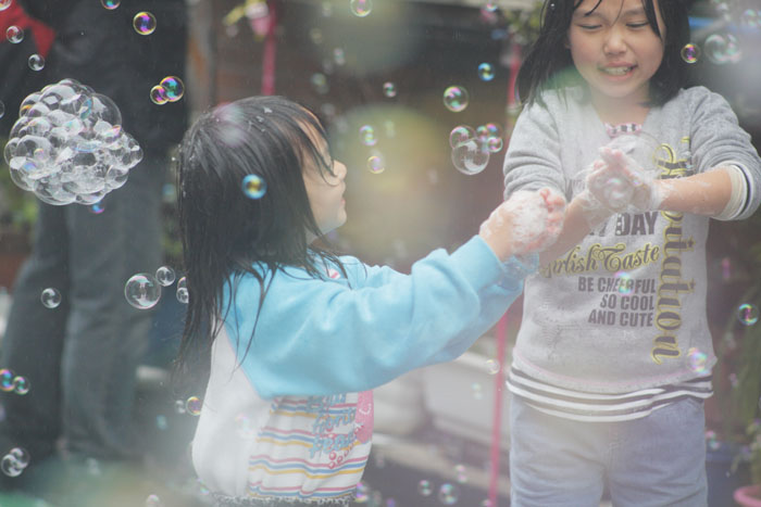 無数のシャボン玉が見慣れたまちの風景を一瞬にして光の景色に!
