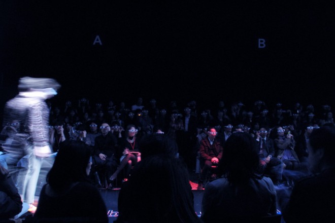 あらかじめ3Dメガネが送られてきていたのですが、そのメガネをかけてショウを観るというモノ。いわゆる生地のプリント部分?が立体的になるという感じらしいのですが、モデルも動いていたのでちょっと分かりづらかったかも。でも、発想はオモシロいですよね。