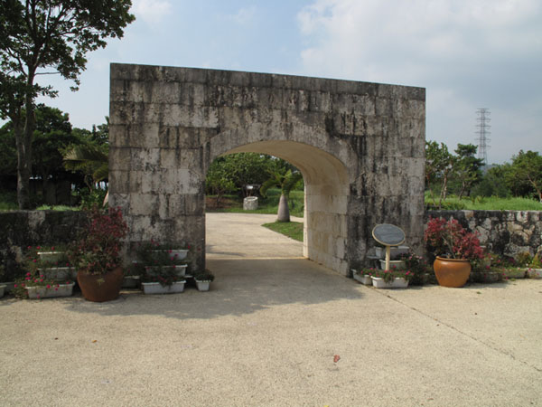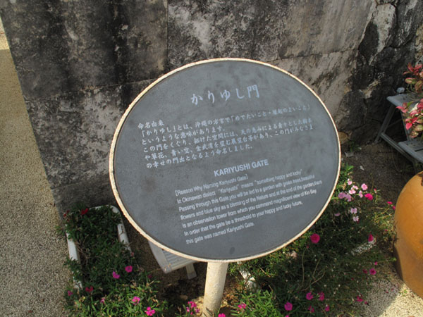 途中、伊芸サービスエリアで休憩をとると、なにやら「かりゆし門」なるちょっとした観光スポットを発見。後で調べてみると2000年に開催された九州・沖縄サミットの際につくられたモノとのこと。
