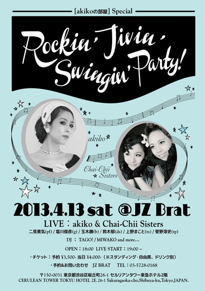 ジャズシンガーの”akiko”が主宰するスウィギンなジャズライブイベント『akikoの部屋』の第4回目が、2013年4月13日に渋谷のJZ BRATにて開催することが決定した。