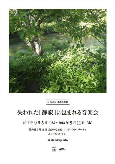 岩本町のカフェ”OnEdrrop”にて開催中のイベント『N Rollin’』が3周年をむかえ、2013年9月5日から2013年9月11日まで、サラウンド自然音とDJのイベント『失われた「静寂」に包まれる音楽会』を開催する。