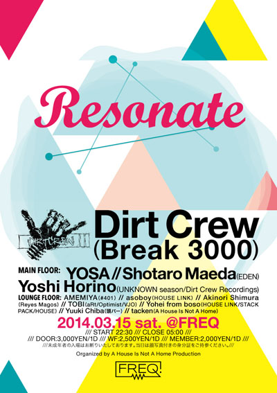 ドイツのハウスミュージックを代表するアーティストでありレーベルの”Dirt Crew(Break 3000)”が来日し、2014年3月15日に開催される『Resonate』@西麻布”FREQ.”にて登場する。