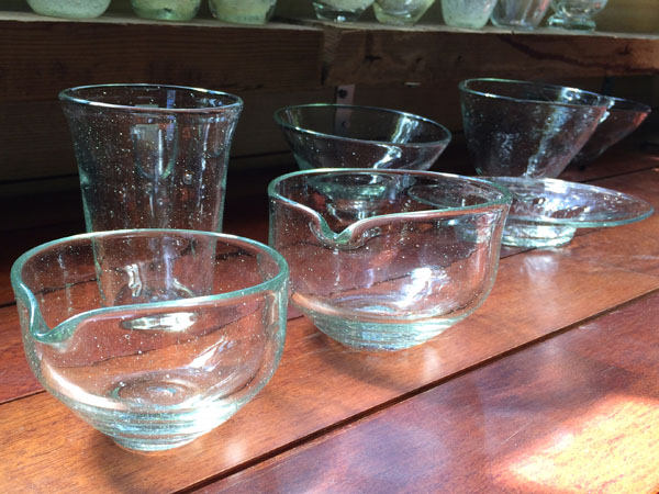 泡盛などのボルを再利用して作られるグラスやお皿はどこかおおらかで女性的なフォルムで、