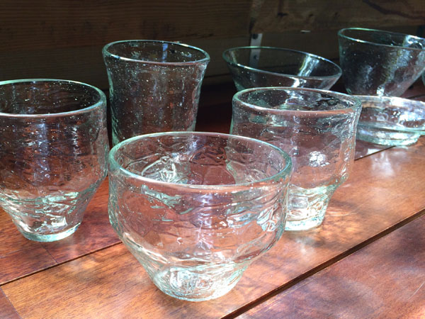 今回は、瓶ビールや泡盛などの廃瓶を利用してつくられる再生吹きガラスを使用し、酒場や食堂などで使われるようなプラスチックで大量生産のコップ、いわゆる薄茶色でたくさん重ねてあるグラスや、瓶ビールをたのんだ際にいっしょに出されるグラス、いわゆるビール会社のロゴがついているアレね、をあえてその吹きガラスで制作。