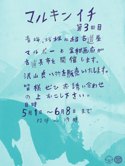 目黒の金柑画廊にて、すでに恒例となりつつある青梅市の古道具屋マルポーをむかえた、古道具市『マルキンイチ』を、2014年5月1日から開催する。