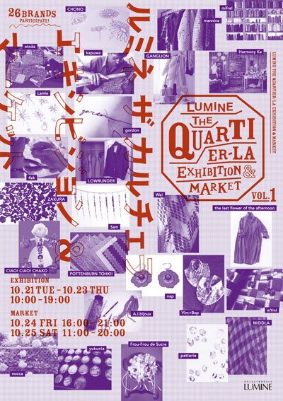 “LUMINE”が提案するあらたなマーケット「LUMINE the QUARTIER-LA Exhibition & Market(ルミネザカルチェラエキシビジョン& マーケット)」が、2014年10月24日と25日の2日間、北青山にある”未来研究所 未来研サロン WORK WORK SHOP”にて開催される。