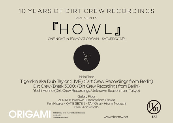 ベルリンの名門エレクトロニック・ハウス・レーベル「DIRT CREW RECORDINGS」が設立10周年をむかえ、2014年11月1日にアニバーサリーイベント『HOWL』を表参道ORIGAMIにて開催する。