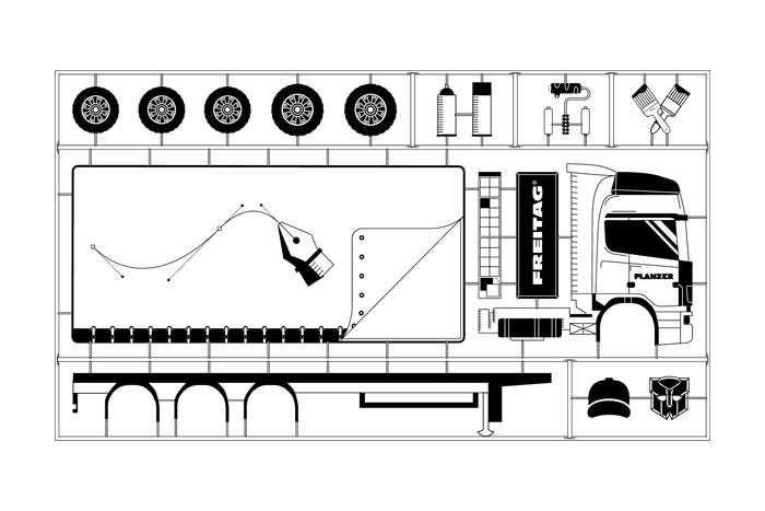 今回デザインされたトラックタープは、遅かれ早かれフライターグのバッグデザイナーによってカットされ、世界に一つしかない、誰もが振り返って釘づけになるような鞄へと生まれ変わることを考えると、今回のデザインは一歩先を見据え、細部のデザインにまでこだわったものである必要があります。