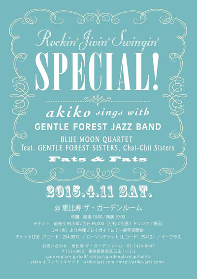 JAZZを中心に、さまざまなジャンルで活躍するヴォーカリスト”akiko”が、ニューアルバム『Rockinʼ Jivinʼ Swinginʼ』のリリースライブ『Rockin’ Jivin’ Swingin’ Special!』を、2015年4月11日に恵比寿ガーデンルームにて開催する。