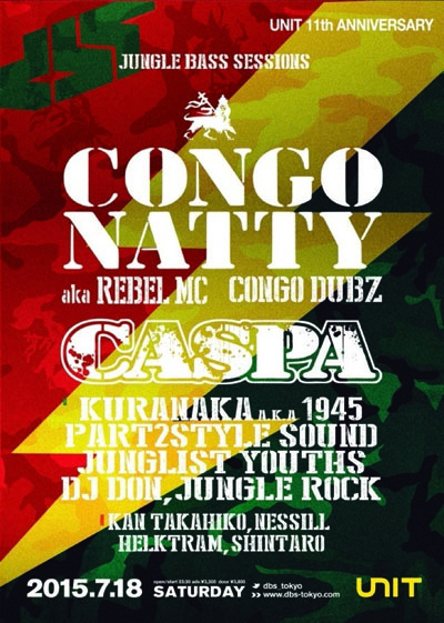 JUNGLEの帝王”CONGO NATTY aka REBEL MC”と、「Dub Police」のボス”CASPA”が共演するスペシャルな『DBS』、『JUNGLE BASS SESSIONS』が、2015年7月18日に代官山UNITにて開催される。