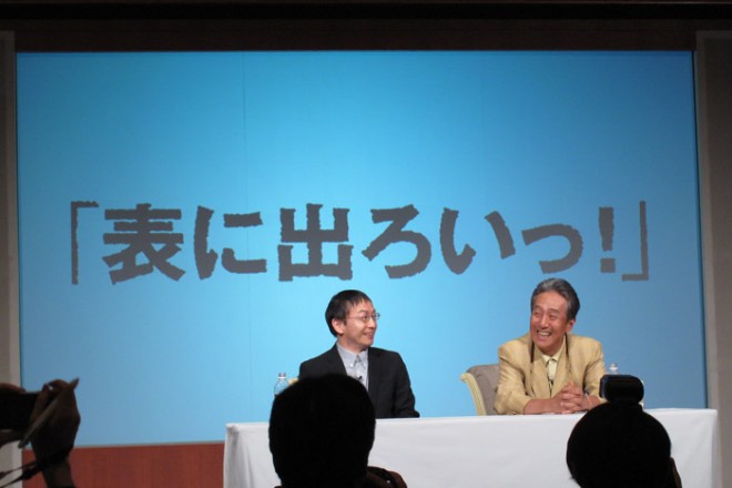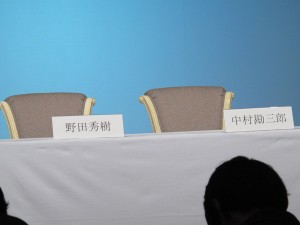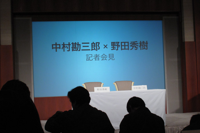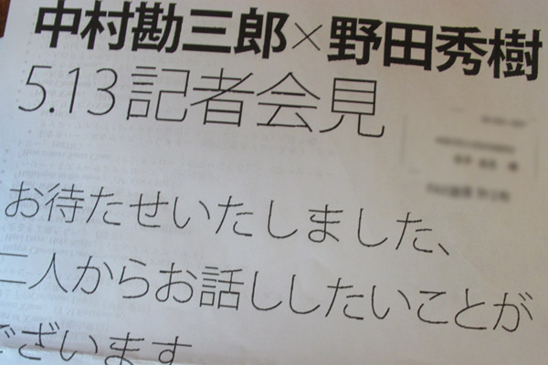 緊張が走る報道陣を横目に、まず登場したのが黄色いジャケット姿の中村勘三郎さん、つづいて紺のジャケットの野田秀樹さんが登場。しかも、さっそく位置を間違えてすわるふたり。