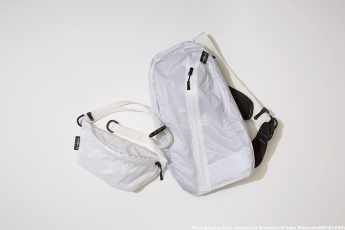 そして、セーリングの帆などで使用される、透け感のあるリップストップナイロンを使用した、ウェストポーチとワンショルダーバッグ。