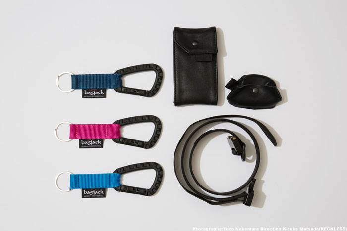 さらに、ミリタリーで使用される「ITW」社のカラビナをつかったキーリングや、車のシート用インダストリアルレザーを使用した13枚のカードを収容できるカードケースとコインケース、そして「AustriAlpin」社のcobra buckleを使用したガチャベルトも登場だ。