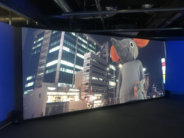 今回の個展では、巨大なネズミが数日間深夜徘徊するという内容で、この巨大ネズミを動かすために、何人ものアーティストや友人が代わる代わるともに夜を明かしたという映像記録が作品となっている。