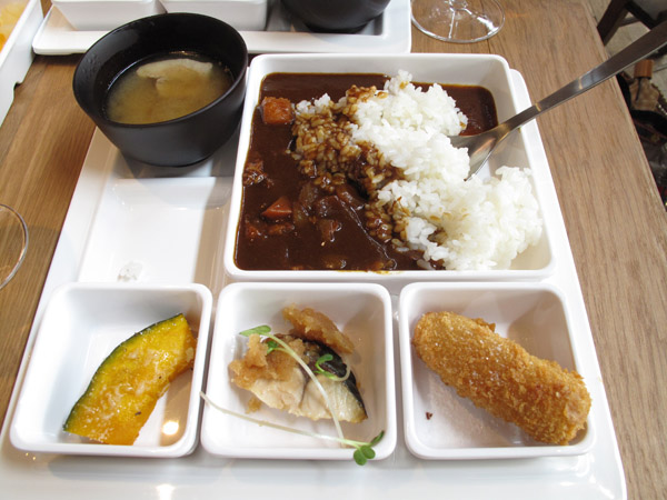 豚汁、野菜&ビーフカレー、カボチャのさらだ、サバの塩焼きおろし付き、コロッケ。