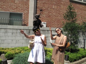 銅像と同じポーズをとる”NOEMI”さん(右)と”MOMOKOMOTION”さん(左)。