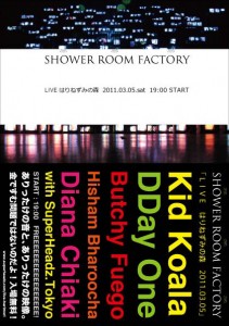 出演は、カナダから”Kid Koala”、ロサンゼルスから”DDay One”、ニューヨークからはBOREDOMSのメンバーでもある”Butchy Fuego + Hisham Akira Bharoocha”、そしてトーキョーからは”Diana Chiaki”と、国内外からいま絶対聴くべき実力派アーティストたちが代官山”ShowerRoomFactory”に集結する。
